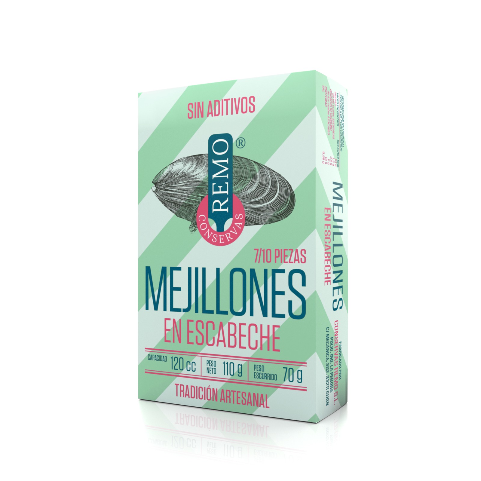 Ingredientes: Mejillones (Mytilus Galloprovincialis), aceite de oliva, vinagre de vino, ajo, laurel, especias y sal.
